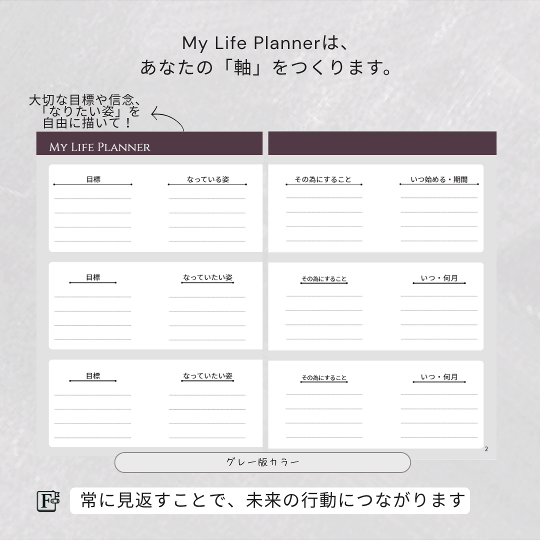 - Life Planner:「目標」「なっている姿」「行動」「期限」を記し、月・週の計画に落とし込める一貫設計。